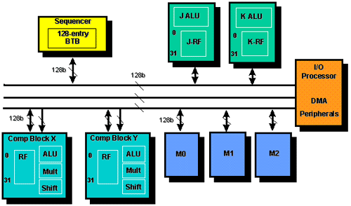 Высокая пропускная способность памяти TigerSHARC обладает архитектурой памяти с малыми векторами, организованной в трех 128-разрядных банках. Quad (128-разрядный), long (64-разрядный) и normal (32-разрядный) доступы перемещают данные для операций из банков памяти в регистровые файлы. В данный цикл, могут быть выбраны четыре 32-разрядных слова инструкции, и могут быть загружены 256-разрядные данные в регистровый файл или записаны в память. Высокоэффективная архитектура памяти может хранить 8-, 16- и 32-разрядные данные в смежной, упакованной памяти. Внутренняя и внешняя память организованы в унифицированную схему распределения памяти. Разделение между памятью программ и памятью данных определяется пользователем. Поддержка целочисленного АЛУ. Генерация адреса данных Два целочисленных АЛУ, названные, JALU и KALU, доступны для адресации и обновления указателя. Они поддерживают циклическую буферизацию и инверсию разряда, и каждый из них имеет собственные 32-разрядные регистровые файлы. Кроме простых модулей генерации адреса данных, оба IALU поддерживают универсальные целочисленные вычисления. Универсальность IALU позволяет компилятору повысить гибкость программирования. Четыре инструкции за цикл Вычислительные ресурсы контролируются секвенсором, который может параллельно выдавать до четырех 32-разрядных инструкций. Одна или две из этих инструкций может управлять более чем одним вычислительным модулем, экономя размер кода и энергопотребление. Программист обладает гибким подходом для направления индивидуальных инструкций каждому вычислительному модулю. Секвенсер поддерживает упреждающее выполнение, когда каждая индивидуальная инструкция выполняется в согласии с результатом, полученного ранее условия. Нет аппаратных режимов Архитектура не зависит от аппаратных режимов. Это позволяет избежать холостых циклов и упрощает операции компилятора. Набор команд напрямую поддерживает все операции DSP, обработки изображений, видеоизображений, арифметические типы включают знаковые, беззнаковые, дробные и целые данные. Имеется необязательный предел насыщения для всех арифметических операций. |
