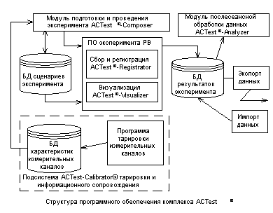 - Модуль подготовки и проведения эксперимента ACTest©-Composer - создание, изменение, поиск, хранение и запуск сценариев экспериментов. Программное обеспечение реального времени состоит из двух независимых частей: ACTest©-Registrator - подсистема сбора и регистрации в реальном времени, включающая программы первичной обработки, и ACTest©-Visualizer - средства визуализации. Обе подсистемы способны работать как единое целое на одном компьютере или по отдельности на различных компьютерах;