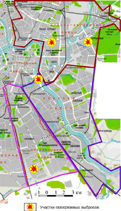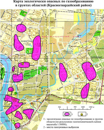 Рис. 2. Карта экологически опасных по биогазу в грунтах областей (на примере одного из районов Санкт-Петербурга)