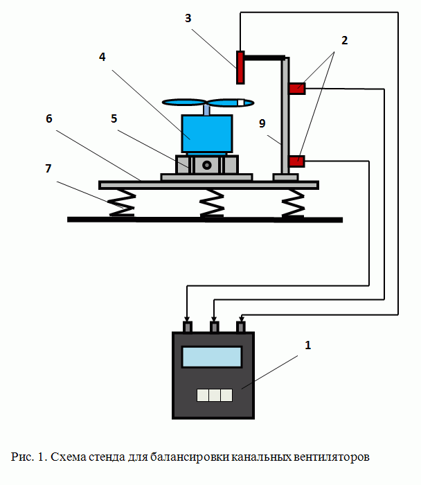 Указанные стенды обычно разрабатываются для балансировки конкретных изделий или деталей. Причём главной целью их создания (естественно помимо достижения заданного качества балансировки) является необходимость сокращения издержек, связанных с приобретением и эксплуатацией штатных балансировочных станков. Ведь ни для кого не секрет, что стоимость этого вида оборудования высока и, в зависимости от массы и габаритных размеров балансируемых роторов, может колебаться от сотен тысяч до нескольких миллионов рублей. В этой связи хотелось бы поделиться опытом, накопленным нашим предприятием при решении данных нестандартных балансировочных задач. Возможно, он будет полезен специалистам, стремящимся оптимальным образом решать задачи по балансировке выпускаемой ими продукции. Тем более, что сейчас появился новый относительно недорогой балансировочный прибор «Балком 1», который может использоваться в качестве измерительно-вычислительной системы в любых балансировочных стендах. 1. Стенды для балансировки канальных вентиляторов Когда в конце 90-х годов прошлого века на ЗАО «Вентиляторный завод «Лиссант» было начато производство канальных вентиляторов, возникла необходимость разработке специальных стендов для их балансировки. Указанные стенды разрабатывались нашими специалистами совместно с конструкторским отделом ЗАО»Лиссант». Основными требованиями, предъявляемыми к этим стендам, являлись высокая точность балансировки в двух плоскостях, характеризующаяся уровнем остаточной вибрации не выше 0,05 мм/сек на частоте вращения ротора, и производительность, которая должна была составлять не менее 20 изделий в час. После ряда экспериментальных проработок была выбрана конструкция стенда, представленная на рис. 1. Указанный стенд состоит из платформы 6, установленной на трёх пружинных опорах 7. Характеристики пружин выбраны таким образом, чтобы собственная частота колебаний стенда на пружинах составляла не более 1/3 частоты вращения ротора канального вентилятора. Это обеспечивает эффективную отстройку стенда от установочного резонанса и способствует достижению высокого качества балансировки. На платформе закреплён патрон 5 (цанговый или кулачковый), обеспечивающий возможность быстрого установа на стенд и съёма с него балансируемого вентилятора 4. На платформе также закреплён кронштейн 9, используемый для крепления на стенде двух датчиков вибрации 2 и датчика фазового угла 3. Датчики подключены к соответствующим входам измерительно-вычислительного блока прибора для балансировки 1, с помощью которого производится измерение вибрации вентилятора на частоте его вращения и расчет параметров корректирующих грузов, обеспечивающих надлежащее качество балансировки канальных вентиляторов. Для повышения производительности балансировки в качестве корректирующих грузов используются наборы специальных пружинных клипс (разной массы), устанавливаемых на лопастях вентилятора. В настоящее время на подобных стендах балансируются все типоразмеры канальных вентиляторов, изготавливаемых ЗАО «Вентиляторный завод «Лиссант». ![]() 2. Стенд для балансировки вакуумных насосов Стенды для балансировки вакуумных насосов разрабатывались по заказу ОАО «Завод «Измеритель» в 2002 и 2009 годах. Основным требованием при разработке данных стендо