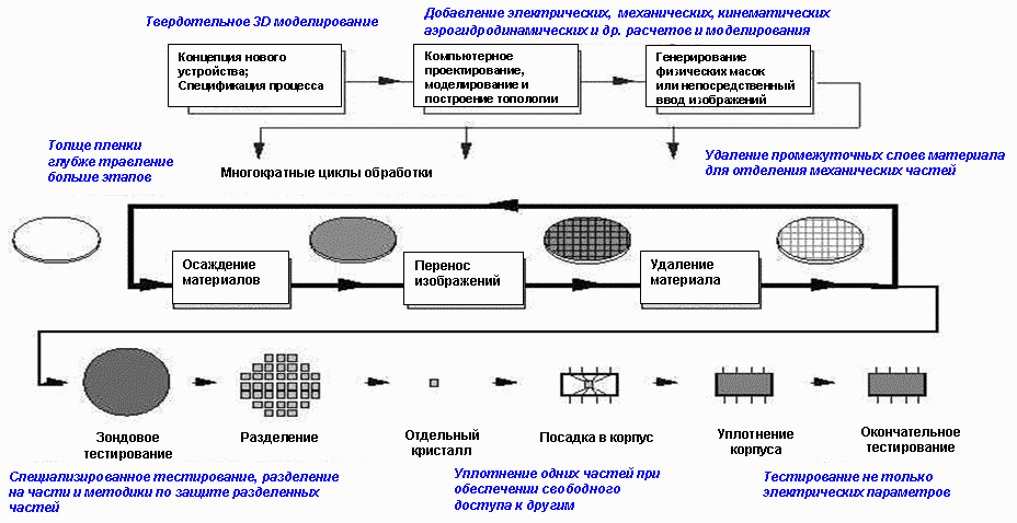 Как традиционные, так и модифицированные для создания МЭМС процессы строятся на многократных циклах осаждения материала, переноса