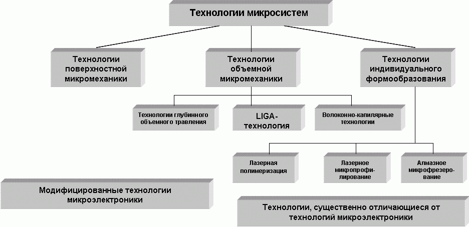 В рамках технологии микросистем развиваются следующие направления (Рис. 3). 1. Групповая технология поверхностной микромеханики на основе процессов тотального (послойного) напыления и избирательного удаления слоев. 2. Групповые технологии объемной микромеханики, реализуемые в виде: