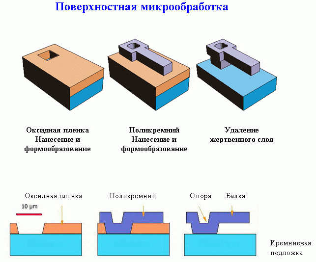 | 2. Технологии микромеханики В отличие от микроэлектронных чипов, микромеханические изделия, как правило, содержат движущиеся или деформируемые элементы. Толщина микромеханических элементов может превосходить их минимальные размеры в плоскости и микромеханические системы (МЭМС) представляют собой трехмерные структуры (3D структуры).