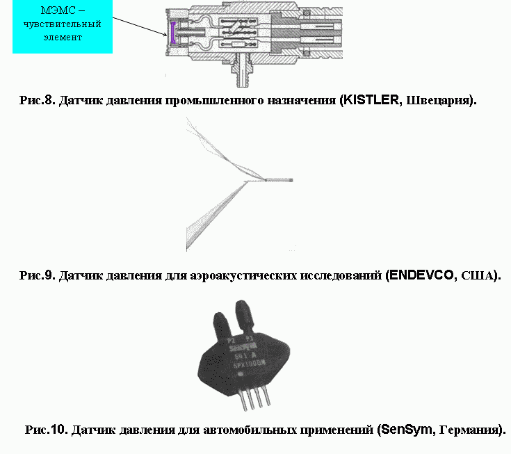 Для приборостроения миниатюризация - естественный процесс. Разработка датчиков идет эволюционным путем, реализуя на основе вновь осваиваемых технологий в меньших габаритах традиционные схемы и структуры. Кроме этого, могут появиться возможности для построения новых структур и необходимость использования принципов действия не оптимальных и потому не популярных в макромасштабах. Для создания микроэлектромеханических устройств характерно использование практически всего существующего арсенала методов преобразования и типов датчиков (сегодня хотя бы на уровне “лабораторных” университетских разработок). Реализуются и новые подходы: так находят все более широкое применение уравновешивающие преобразователи электростатического типа. Микроразмеры элементов и макроколичества одновременно обрабатываемых изделий - две основополагающие особенности, которые микротехнологии унаследовали от микроэлектроники. Первая особенность позволяет изготавливать прецизионные уникальные изделия, размеры и взаимное расположение которых воспроизводятся с субмикронными точностями. Вторая – делает эти устройства дешевыми и доступными для массовых применений. «Успешные» МЭМС датчики характеризуются, кроме высоких метрологических качеств и небольших габаритов, высокой экономичностью, малой материалоемкостью, хорошо сопрягаются с электроникой. Для наиболее «продвинутых на рынок» массовых датчиков стоимость на порядок ниже, чем у макроаналогов. Типичные размеры МЭМС – чипа 1…10 мм2. В эти габариты вписываются механические, электронные и др. элементы. Такие размеры позволяют создавать датчики для измерения «точечных» (локальных) параметров, снизить влияние массы датчика при измерении ускорений, уменьшить нежелательные эффекты (раздражение) при медико - биологических исследованиях. Малые размеры облегчают экранирование, теплоизоляцию и термостабилизацию. Применение в конструкции микроколичеств чистых и редких материалов, прецизионных сплавов не удорожает стоимость существенно. Микродатчики незаменимы при динамических измерениях – с уменьшением размеров снижается масса чувствительных элементов и постоянные времени реакции датчиков на изменение измеряемого параметра. В микромасштабах изменяются привычные соотношения между различными полями. При линейном уменьшение размеров «массовые» силы убывают в кубе, а «поверхностные» только в квадрате. Возрастает влияние вязкости, в устройствах различных приводов (уравновешивающих, резонаторных и др.) наиболее эффективными оказываются электростатические, а не привычные электромагнитные. Платой за малые размеры часто оказывается падение чувствительности, увеличение роли тепловых шумов. Ставка на более чувствительные полупроводниковые преобразователи может обернуться увеличением температурных погрешностей. Разработка МЭМС – устройств это привычный для приборостроения путь компромиссов. Путь к созданию микроэлектромеханических датчиков, отвечающих тем или иным «жестким» требованиям, может увести от размеров микрочипа к «привычным» макрогабаритам для конструкции датчика в целом. Так на рис.8-10 представлены МЭМС - датчики давления различного назначения, имеющие практически одинаковые основные метрологические показатели: диапазон измерения, точность. |
