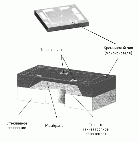| 5. Особенности МСТ – изделий: датчики давления На примере датчиков давления особенности микроэлектромеханических изделий проявляются достаточно ярко. Датчик давления тензометрического типа - наиболее успешно продвинутый продукт МСТ. Кремниевые датчики давления - первые серийно выпускаемые микроэлектромеханические изделия, выполненные модифицированными методами микроэлектронных технологий (1966-68гг.). Это самые массовые МЭМС – изделия: при объеме рынка датчиков давления в США более 500 млн. штук в год, уже в 1996 г. до 80% составляли микромеханические датчики. Основными потребителями датчиков давления являются автомобильная и аэрокосмическая промышленность, энергетика, химия, медицина. Чувствительный элемент датчиков – кремниевый чип может отличаться по размерам, но топология элементов и конструкция чипа большинства датчиков весьма схожи. Тензочувствительные структуры (как правило, резисторы), интегрально (как одно целое) выполнены на поверхности тонкой мембраны, прецизионно вытравленной в «теле» чипа (рис. 11). Тензочувствительность кремниевых резисторов в 10…100 раз выше, чем у металлических (проволочных или фольговых) тензометров. Если это требуется, на поверхность чипа наносят покрытия для защиты от воздействия среды. К мембране необходимо подвести измеряемое давление – соединить под- и / или надмембранное пространство с измеряемой газообразной или жидкой средой. Чип устанавливается в корпус. Тип корпуса определяется назначением датчика. Для соединения применяют сварку, пайку и склеивание. При использовании пластиковых корпусов соединение выполняется склеиванием (рис.12). С металлическими корпусами чипы приходится соединять через «проставок», т.к. различное расширение материалов в диапазоне эксплуатационных температур создает паразитную деформацию мембраны, внося погрешность в результаты измерений. Стеклянное основание сваривается с чипом (рис. 11), основание соединяется с корпусом пайкой или склеиванием. В конструкциях прецизионных датчиков используются более сложные решения (см. например рис. 13). Электрическую схему чипа (для датчика тензометрического типа – это резистивный мост) необходимо соединить с внешними выводами. Контактные проводники следует закрепить, например как на рис. 12. Вернемся к теме затронутой к конце раздела 3. МЭМС - датчики давления разного назначения существенно отличаются по размерам, конструкции, степени сложности и стоимости при практически одинаковых основных метрологических показателях. Так датчики (рис.8-10) обеспечивают измерения давления в диапазоне 0…100 кПа с погрешностью 0,5% при нормальный условиях. Для большинства промышленных применений миниатюрные датчики в настоящее время не типичны. Необходимость надежной защиты от внешних воздействий, как чувствительного элемента, выполненного в виде чипа, так и коммутационных соединений чипа с внешними проводниками, приводит к тому, что МЭМС – чипы спрятаны глубоко внутри датчиков давления промышленного назначения (см. рис. 8). В результате по металлоемкости и сложности такие датчики незначительно отличаются от традиционных конструкций. Аэрокосмические применения – область, где малые габариты и масса являются одним из решающих аргументов в пользу МЭМС – приборов. Проблема защиты от внешних воздействий здесь также весьма значи