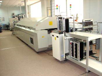 Основой автоматизированной линии SMD-монтажа являются автоматы производства фирмы JUKI, позволяющие производить установку широкого спектра компонентов с высокой точностью. Пайка осуществляется в линейной 8-зонной конвекционной печи TOLO CL8. Точность поддерживания температуры в каждой из зон нагрева ±1°C и максимальная рабочая температура +320°C гарантируют соблюдение всех условий для обеспечения качественной пайки по бессвинцовой технологии.